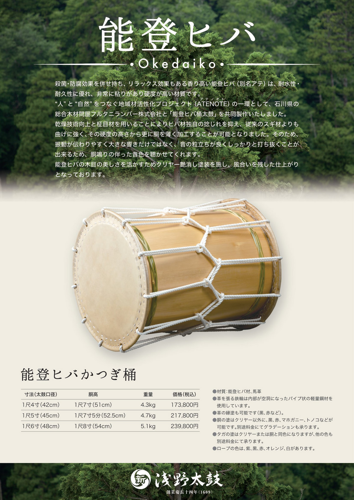 ‟人”と‟自然”をつなぐ地域材活性化プロジェクト「ATENOTE」(アテノオト)の一環として、石川県の総合木材問屋フルタニランバー株式会社と共同制作した、「能登ヒバ桶太鼓」がついに発売となります!!