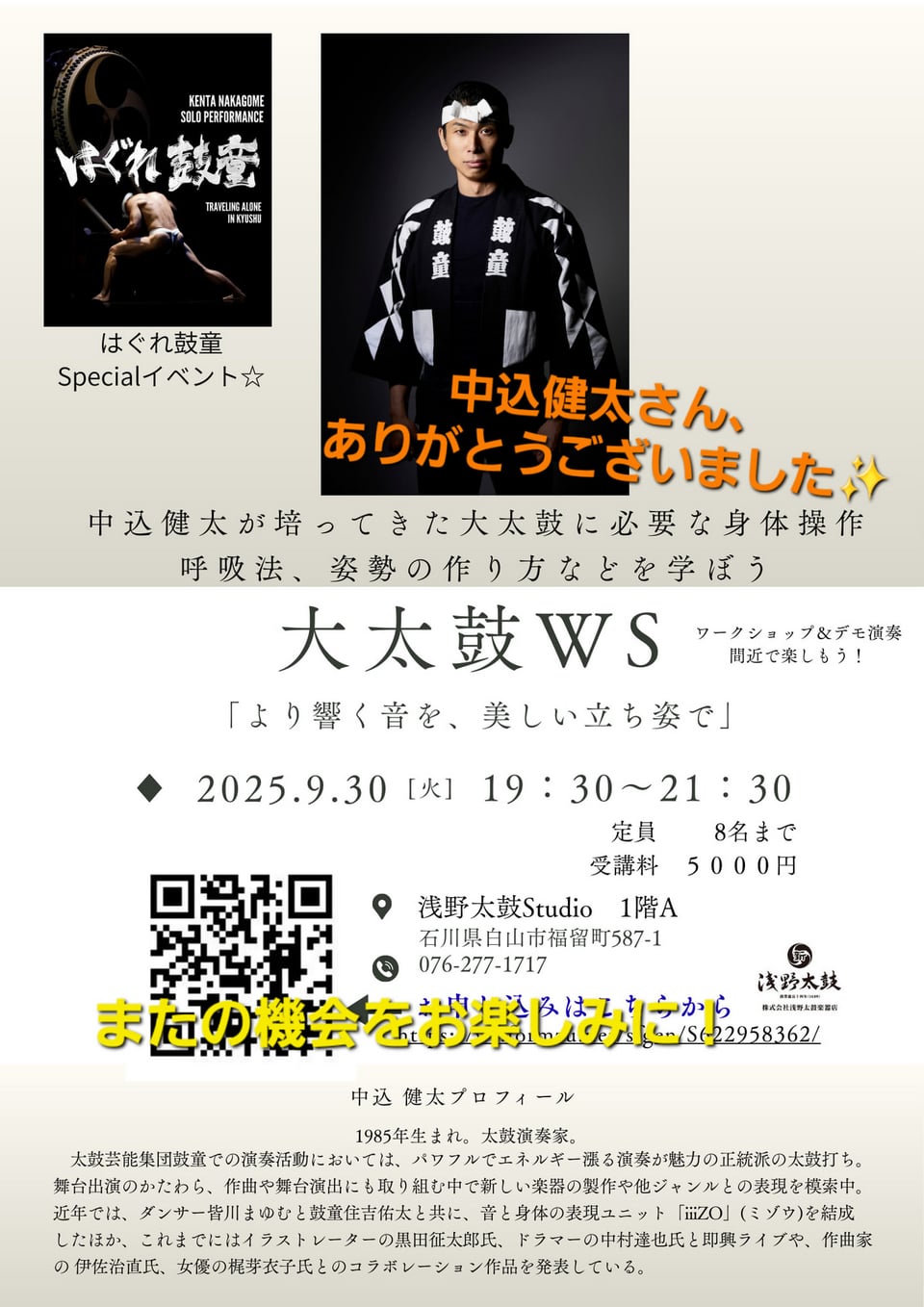 2025年10月 3日 【太鼓芸能集団・鼓童 中込健太さんの大太鼓WS in 浅野太鼓STUDIO】 おかげさまで盛況のうちに終了いたしました! 参加者から、「こんなに意識して体を使っていなかった」「体が楽になった」といった新たな気づきの声も寄せられました。 マンツーマンで個々に合わせたアドバイスの時間もあり、最後には健太さんの圧巻の演奏も披露されました。 なお、今回はあっという間に定員に達してしまったため、ご参加いただけなかった皆さまには申し訳ありません。ぜひ次の機会をお楽しみに! 最新情報は浅野太鼓楽器店の HP・Facebook・Instagram をチェックしていただければ幸いです